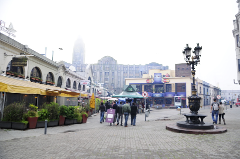 Plaza al lado del puerto entre neblina y humo de chorizo y carne proveniente de la plaza de mercado.