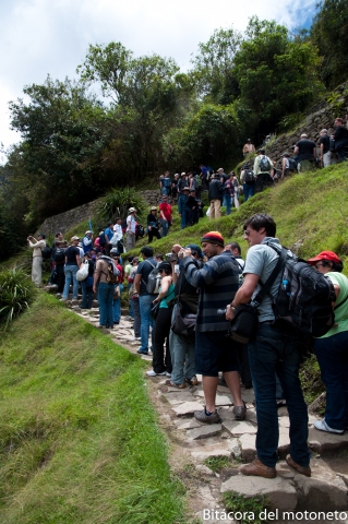 En aguas calientes se toma un bus y lo dejan a uno en la entrada a MP. Vale la pena aclarar que desde la van, a las 6 am, el tren durante 2 horas y en el bus va uno empacado entre enemil turistas que dañan bastante el ánimo que uno pueda traer, ya que siempre se está entre una multitud haciendo filas y atendiendo las instrucciones de unos muy malhumorados funcionarios turísticos.