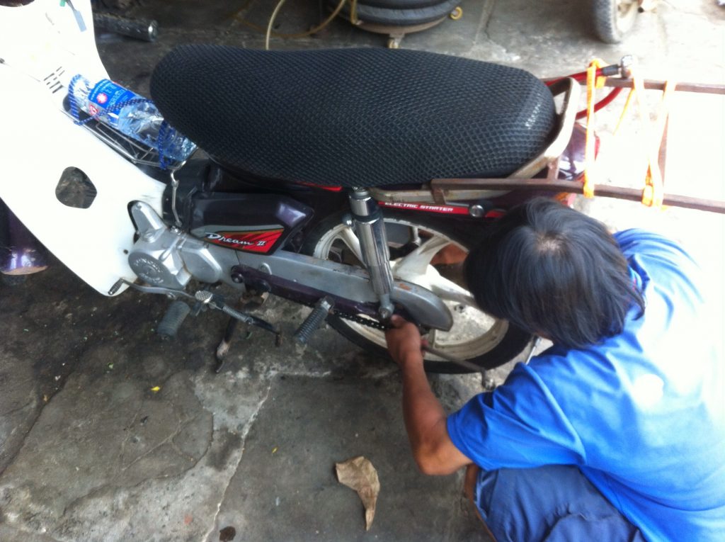 Antecitos de llegar a Cam Be, mi destino en el delta del mekong, la cadena dejo de mover la rueda y en cambio botaba algun material cauchudo. Para resumir. Sali sin dinero para evitar a los policias corruptos, asi que mi billetera tenia lo justico. y ese justico se desvanecio con el mecanico que encontre a 50 metros de la rotura del... no se como se llama, y el hombre me lo arreglo en 3 minutos contados. le pregunte con el google translate cuanto me cobraba de mas por hacer el cambio de aceite y tuvo que venir la esposa a leer el celular. Al final ella lo leyo y fue quien me cambio el aceite y yo me quede sin almuerzo... me gaste toda la platica.