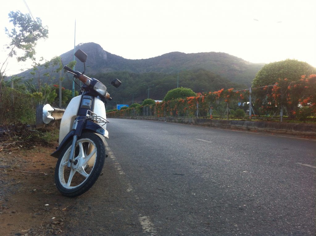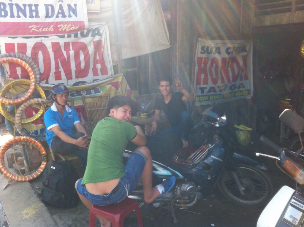 Con conocimiento previo sobre las vertiginosas velocidades y buenos promedios que se hacen con mi escualida, sali temprano. Logre dejar a ho chi minh sin perderme y apenas vi el primer mecanico, pare donde él para reparar el gato. Me cobro un dolar y lo arreglo en tres minutos... me quede tratando de conversar con ellos un rato y cuando me monte en lamoto, esta no prendio. Vuelva y bajese y esperre a que le cambien el cable que va a la bujia y otro coso que no se para que sirve... ahi volaron 600.000 dong (90.000 pesos), toda una fortuna para mi presupuesto diario. Me fui de alla refunfuñando sin saber si me tumbaron, si dañaron la moto mientras conversaba, si era el hombre mas demalas del mundo por dar con unos timadores, o por el contrario, el mas de buenas que la moto pelo el cobre justo donde habia alguien calificado para arreglarla.