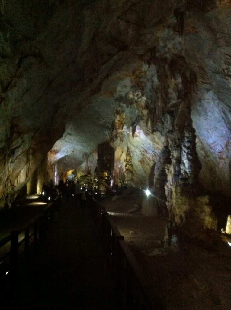 En fin, la paraíso es una cueva de unos 3.5 kilómetros de longitud. Uno (y los chinos) anda el primer kilómetro que tiene senderitos de madera y luces. Si se paga una cifra bastante alta se puede caminar, o arrastrasrse, o nadar la distancia siguiente pero eso toma bastante tiempo y yo no estaba para esos trajines pues en mi unico día completo en Phong Nha todavía me faltaba ir hacia un caserío indígena en la frontera con Laos. De la paraiso creo que le quedan pocos años así de bonita, eso sí, en decoración, digo yo, la desmejoran bastante poniendole luces de diferentes colores en las estalactitas y en las diferentes superficies con la intencion que se vea mas titina, y que los asiaticos, amantes sin salvacion de los selfies, puedan tomarselos con el fondo bien iluminado. Triste es que los visitantes tambien fuman en su interior y que tocan todo sin consideracion... que le vamos a hacer; es su país, pueden hacer lo que les venga en gana.