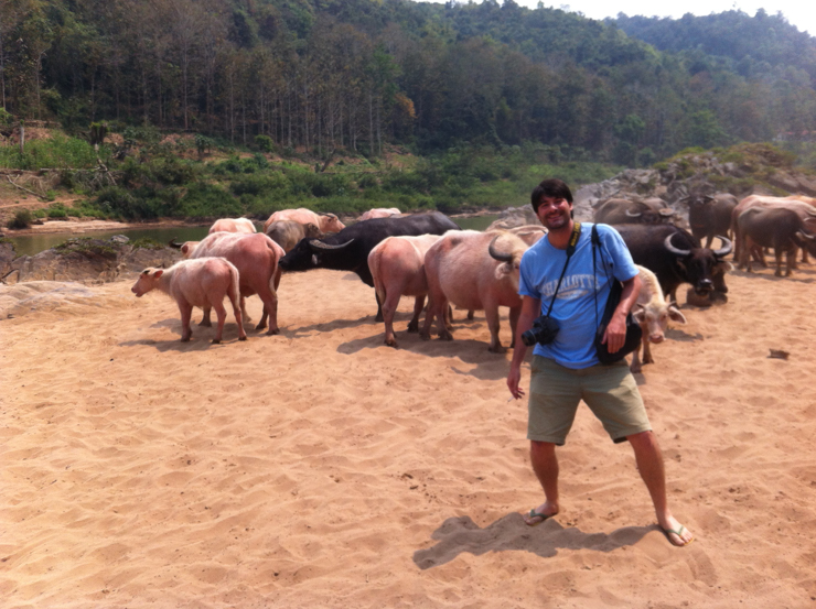 Miércoles, 30 mar 2016Logramos tomar el bote en dirección Nong Khiaw, aguas abajo, parte de él iba a descender en Muang Ngoi y parte seguiría hasta el final, yo me incluía en este grupo. El bote, una canoa grande con una hélice instalada casi en la superficie, navegaba por un río sin corriente. En tres puntos donde los rápidos son más bajos de lo normal, debíamos bajar de él y caminar por la playa entre bueyes hasta un punto más adelante donde embarcábamos de nuevo. Las panorámicas iniciales no eran especiales, aparte de selva, se ven uno que otro grupito de bueyes con las cabezas fuera del rio, sin embargo, a medida que el barco se acercaba a Muang Ngoi, unas montañas encañonaban al río y la panorámica mejoraba.