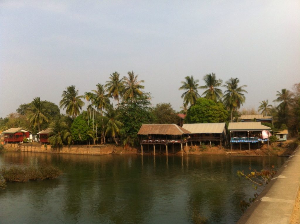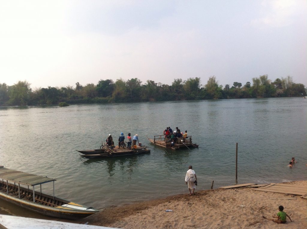 Pasó al rato un ayudante del bus con botellitas de agua para todos los pasajeros. La mala fortuna quiso que la mía se cayera y se reventara. Así, con una botella de PET de medio milímetro de espesor ,con un hueco en la base, me encontré yo con un chorrito de agua mojando todo a mi alrededor. Sin saber qué hacer, la puse boca arriba dentro de mis tenis y, con un buen Solpidem, dejé el mundo de los vivos para despertarme a las 5 de la mañana bien cerquita de Pakse, lugar donde teníamos que cambiar de bus. Ya se imaginarán en qué estado encontré mis tenis… mojaditos, mojaditos. En fin, en la estación de Pakse esperamos una buena hora y media hasta qué aprecio otro bus destartalado que nos llevó hasta el puerto de Nakaset, nuestro puerto. Allí, en canoa cruzamos el Mekong y llegamos a Don Det*.