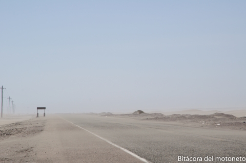 La carretera hasta las famosas líneas de nazca (que no se ven) es estrecha, mala y con viento en contra, pero una vez se pasa el pueblo de nazca la vía se vuelve más mala y el viento en contra incluye toneladas de arena que no dejan ver, ya que se mete dentro del casco.