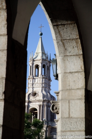 Llegué a Arequipa a las 3pm, de una a almorzar en uno tantos buenos restaurantes que tiene, después, turistear; la parte de la ciudad que vale la pena es muy pequeña y en hora y media de caminada creo que ya la vi toda. La llaman la ciudad blanca, eso porque sus ladrillos son grises pero el cemento entre ellos es blanco. Detrás tiene unos nevados que no tengo idea como se llaman y al lado un volcán tutelar, un cono perfecto con nombre bien sonoro: El Misti.
