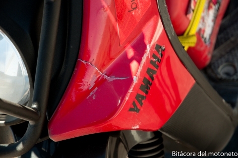 Se reventó el plástico del frente, ya la moto no será tan fotogénica como antes, pero el que creía que la bws iba a volver intacta… Jua. También se raspó el protector del cardan, el coso cortaviento de la mano y el baúl.