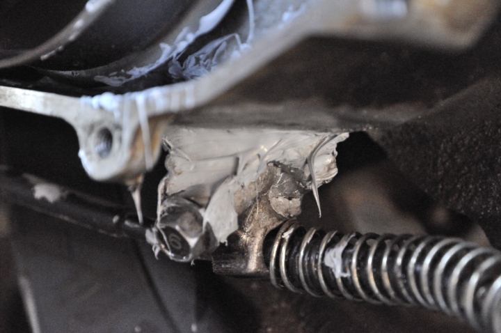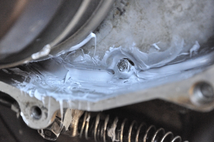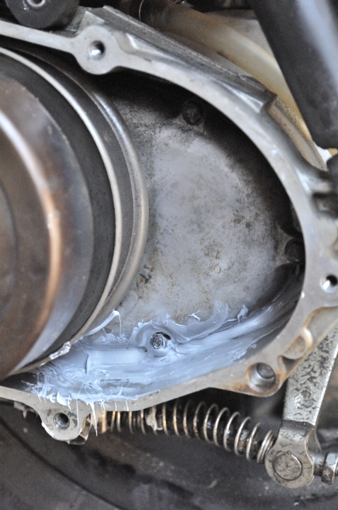 La forma de arreglarlo es con el muy eficiente pegote de silicona, el problema es que para poner la silicona bien se necesita abrir la cámara secreta y aplicar la silicona en los bordes, para esto se necesita una herramienta especial que no conseguimos así que se hizo lo que mejor se pudo siendo chambones… Llenar todo de silicona para que nada salga y así con fortuna llegar a argentina donde posiblemente hayan talleres más apropiados para hacer el arreglo definitivo. Cómo evidentemente hubo un desgaste en la transmisión (no sabemos cuánto) se les pide a los creyentes que prendan una velita por la moto y le recen al santo de su preferencia.