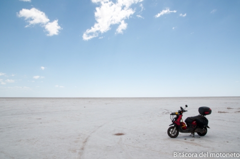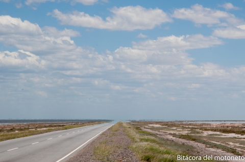 El problema es que el recorrido esta vez era larguísimo, casi 600km y la vía es completamente recta. Se sale por una parte rural muy vistosa hasta Catamarca, una vez se entra en esta provincia todo se vuelve árido y todo el horizonte está cubierto por matorrales medio amarillosos muy tristes. Según el gps, estoy atravesando un salar, pero la verdad es que todo es muy feo. En el bordecito del horizonte se veía un reflejo blanco, que debía ser el salar que me mostraban al lado. Tuve la fortuna que el salar si vino hacia mi; me encontré una trochita que me llevó al salar y vuelvo a decirlo otra vez: no hay que sufrir yendo a Uyuni, éste salar era diferente de las salinas grandes por Susquez, aunque se llamaba igual, el salar era liso hasta el infinito. Metí la moto como no, y le tome foticos, acá se las pongo.