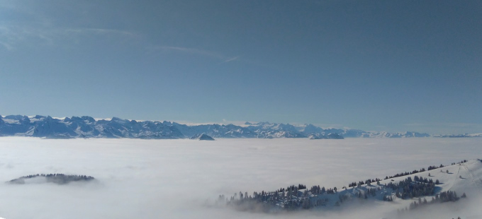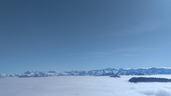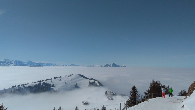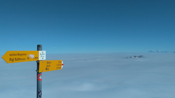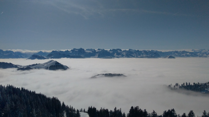 Nada, pero muy bonita la nada, como todo por aquí. En esa ocasión, das Nebelmeer llegó para quedarse e inundar la suiza con su neblina y dejar los picos alpinos como islas prominentes salidas desde el mismísimo fondo del mar – Nebelmeer quiere decir mar de neblina – . Al fondo los picos de los alpes, en la mitad, las montañas de Schwyz y pedazos del mismísimo Rigi. El punto de donde las fotos han sido tomadas no es más que un restaurante lleno de chinos con su respectiva estación de tren y varios miradores.
