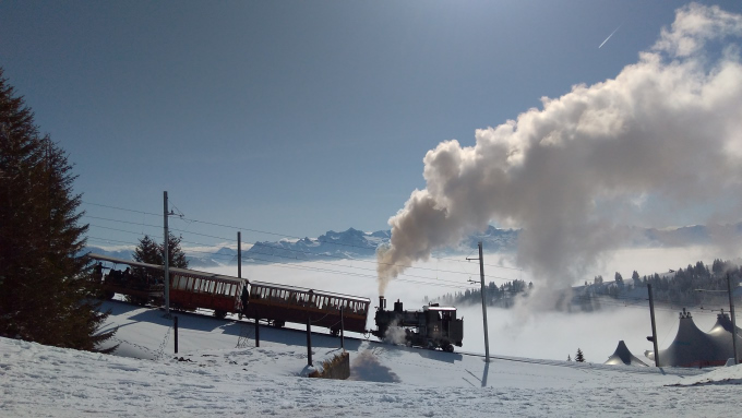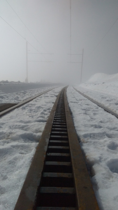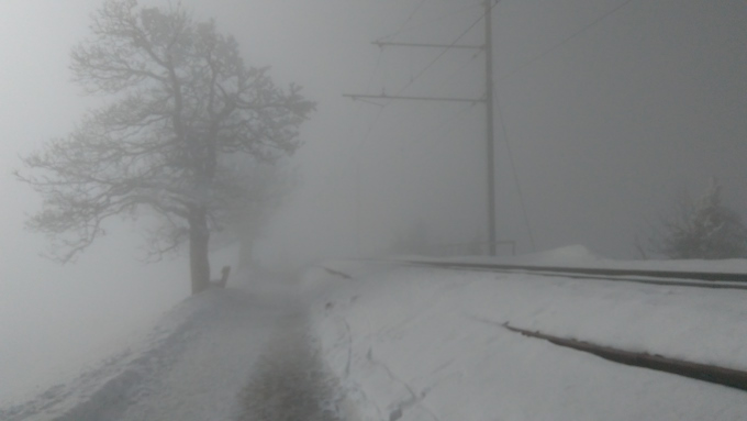 Así pues, desde Goldau, la primera vez, en invierno, en el funicular me he montado y así, despacito, con nadadito de perro, arriba he llegado para ver… ¡nada!