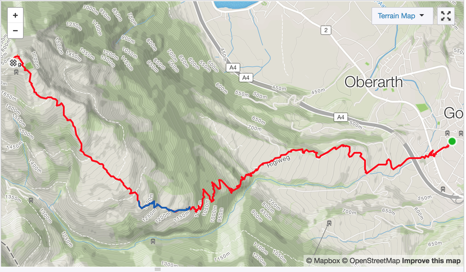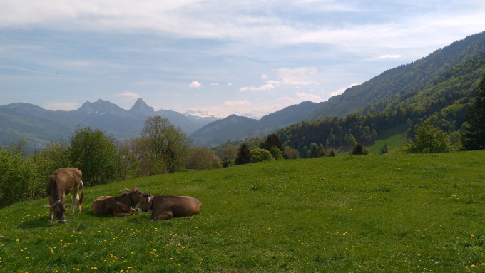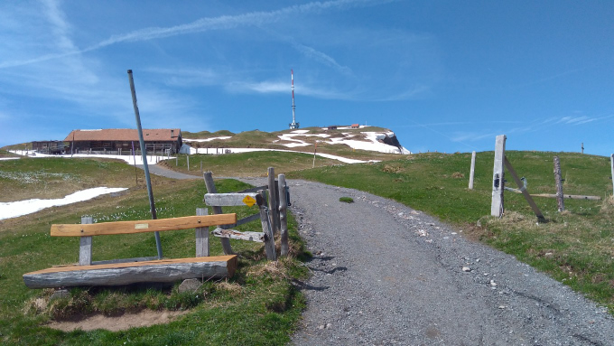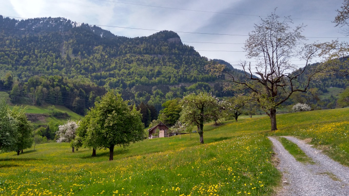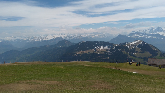 La segunda vez, ahora en primavera, otra vez en Goldau, me he tomado el esfuerzo de trepármela a pie. Goldau queda a unos 500 metros de altura. Rigi Kulm, la cumbre con mejor vista, – y más alta – está a unos 1600. Es un poquito menos que salir desde el río Medellín hasta la vereda El Plan, arriba de Santa Elena en línea recta. Se ascienden unos 1300 metros pasando por lindas praderas, fincas con vacas de museo, bosques, y raros parches de nieve qué, aunque el calor que hace es bastante, vaya uno a saber por qué se aferran con tanta obstinación a la montaña y a la idea de un invierno ya, de hecho, ha acabado.
