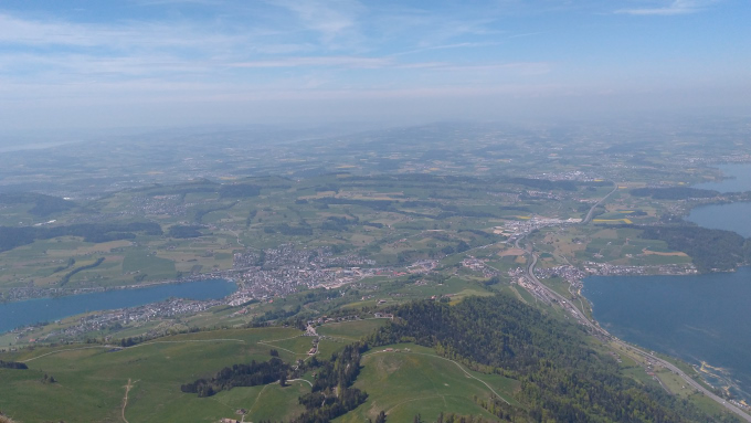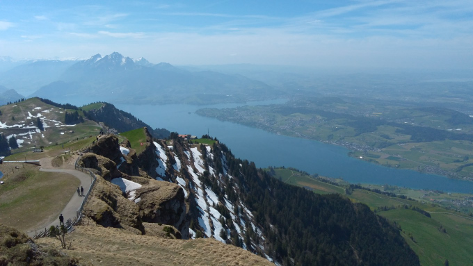 La subida de estos 1300 metros de ascenso y 11 kilómetros de recorrido toma un poco menos de 2 horas, si se está en modo atletico, como lo estuve yo, y ya estando uno arriba, rodeado de motas de nieve, nota uno lo sudado que se encuentra; sudado de pies a cabeza para ser recibido por un viento helado que lo atraviesa a uno de lado a lado. El mirador en esta ocasión ya no tiene el Nebelmeer, sino, en cambio, presenta una panorámica de media Suiza. Las montañas de atrás siguen siendo las mismas, los Alpes, al frente se puede ver el Rigi en toda su extención, y además todo lo que anteriormente había tapado la niebla: Arth, Goldau, el Zugersee, el Lauerzersee, el Vierwalstätersee – el mismo de Lucerna –, al fondo, como gran sorpresa para mi se lograban ver tres lagos; en un mini valle se encontraban los Hallwilersee y Baldeggersee, en otro se alcanzaba a ver Sempachersee. Estos nombres no dirán nada al lector, son simples lagos, pero ya verán en próximas entradas cuando describa la vuelta en bicicleta entre Bellinzona y Basilea, cuando pasé por estos lagos creyendo que estaban lejísimos; sin embargo, ya aquí, montado en el Rigi Kulm se puede uno dar cuenta lo chirriquitica que es la Suiza y como todo queda super cerquita aunque aparente estar más lejos… (los trenes o las rutas en bicicletas deben rodear todas las montañas que tiene el país para ir de un lado a otro, así que cree uno que todo queda más lejos).