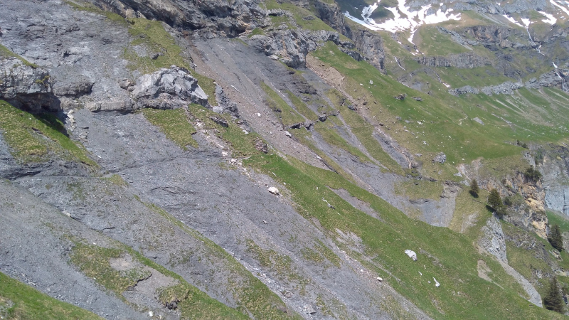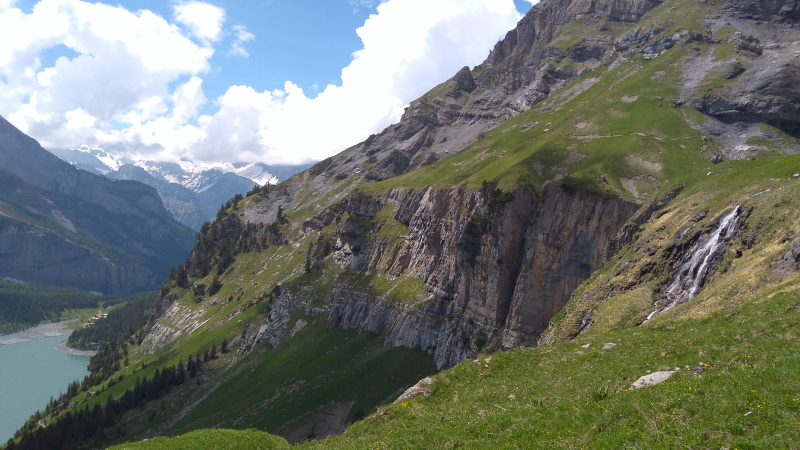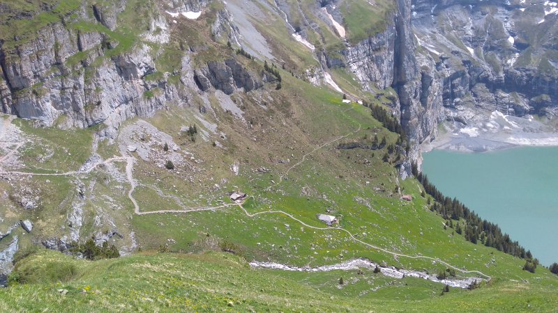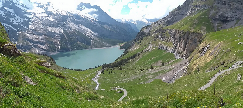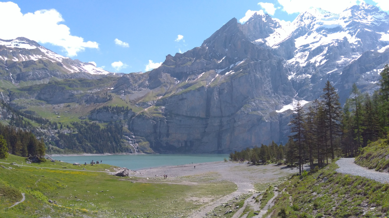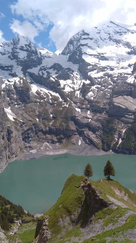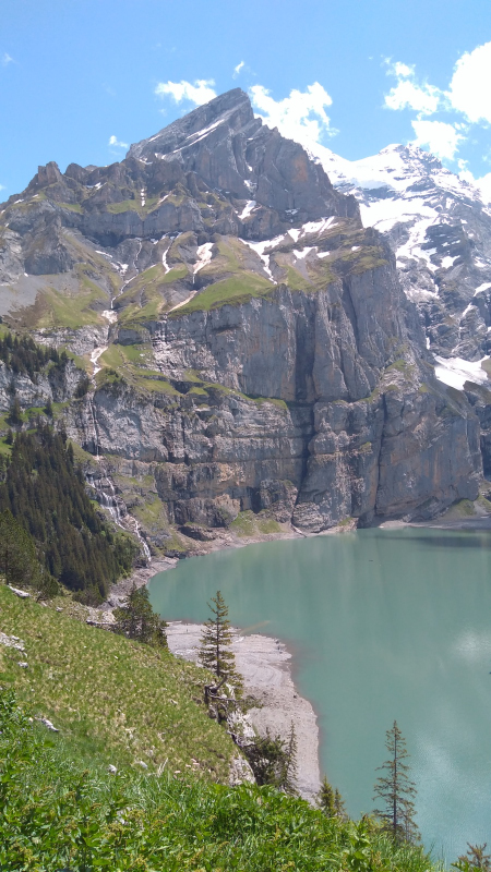 Sábado, 18 ago 2018Volviendo al tema del trekking esta vez volvemos a al cantón de Berna con los limites de Valais. Allí se ubica un pueblito llamado Kandersteg. Arriba del pueblo queda un lago llamado Öschinensee, ese es nuestro destino. Cómo todo trekking, aquí llamado wanderung, primero hay que tomar un tren. Este tren pasa por Berna, la capital, de ahí llega a Thun, a las orillas del lago que tiene el mismo nombre que es uno de Interlagos, (el que casi no se ve en las fotos del Rothorn), sin embargo no nos vamos tan lejos; a mitad del Thunersee (el lago), nos desviamos por un valle llamado Kandertal. (Thal es valle, Kander es un río/quebrada con ese nombre). El valle, como todo por estos lados, es bien bonito, rodeado de montañas nevadas arriba, los bosques en el medio y las vacas con sus campañas abajo. Por ahí pasa el tren, que sube zigzagueando por las montañas hasta que llega al Kandersteg (Kander, de la quebrada. Steg, vaya uno a saber que es). Kandersteg, es pequeño, turístico, aunque el turismo es más bien local y sobretodo familiar o joven, tipo boyscouts o algo así. A mi me tocó medio vacío – gracias a dios – así que feliz y dichoso – sin familias y sin niños – el ascenso comenzó por una calle del pueblo hasta llegar a una estación del teleférico. Si no lo había mencionado antes, pues lo hago ahora: es rara la montaña que no tenga su teleférico; en verano se usan por la vista que hay arriba, en invierno son para las pistas de esquí. En fin, desde la estación del teleférico en adelante el camino es en realidad un sendero que sube permanentemente siguiendo el curso de una quebrada llamada Öschibach, siendo bach, quebrada. Una vez arriba se llega a un lago completamente rodeado por montañas.