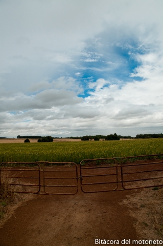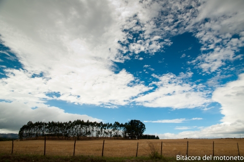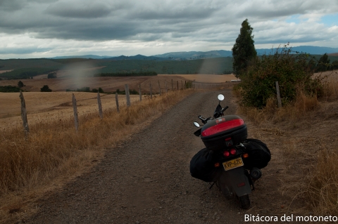 Por fin pude tomar una via rural y no ir por autopista (gracias a una ruta que me dió Lorena y un mapita que me regaló). Es por estas rutas que se puede apreciar mucho mejor lo bonito que es chile. Por esta ruta se ven cultivos de trigo, maiz, manzanas y sauces maderables. el último tramos de la ruta antes de desviarme para Villarrica empezó a llover (y nunca paró); agua y viento frío son siempre recomendados por los medicos para quitarse las bronquitis (y depronto volverlas pulmonía) pero los problemas no acabaron ahi: tambien se acabó el asfalto y por cuenta de la vibración de la moto en la trocha se soltó la parrilla delantera perdiendose los dos tornillos y los 2 bujes. Para reparar la moto lo primero es montarla en el gato, pero siempre es buena idea agarrarla de algo diferente del acelerador ya que aunque ustedes no lo crean, saldrá disparada sin conductor que la guíe y como resultado se rayará. Ya saben, cuidado con el acelerador!
