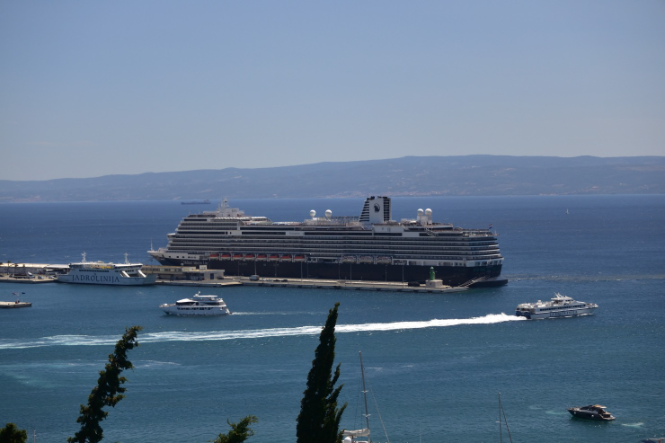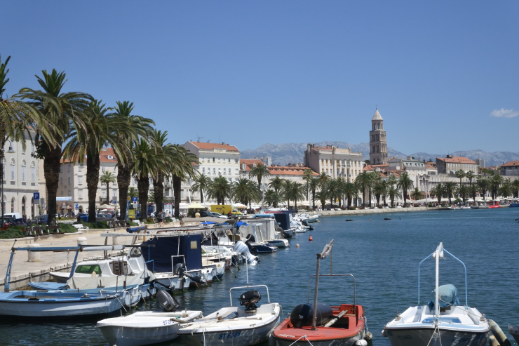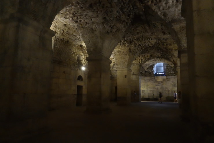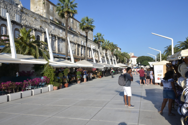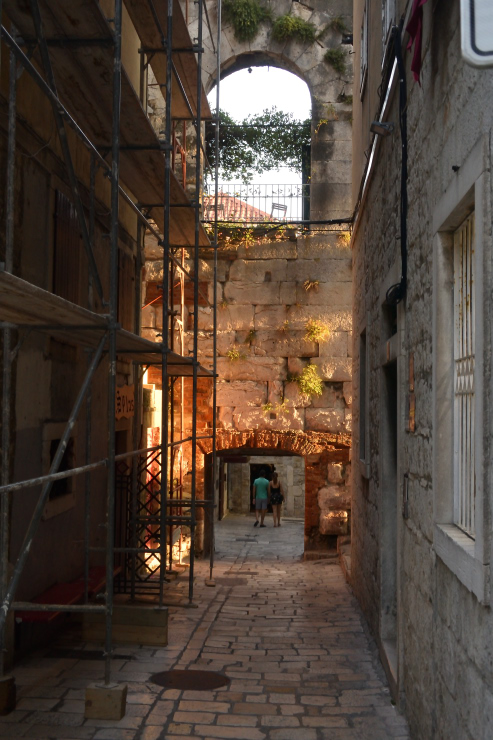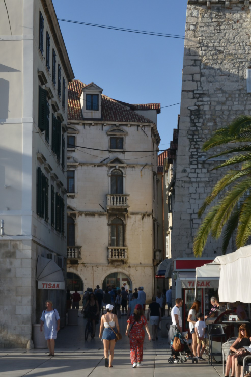 Ahora bien, volviendo a la ciudad que nos compete, podría hacerles una descripción del palacio pero por estadísticas de la página, ya sabemos que eso poco interesa. Si acaso hay alguien entusiasmado por el tema, en google o wikipedia lo puede buscar; tienen datos interesantes. Puedo, eso si, anotar que la ciudad es una típica ciudad dálmata, con callejuelas estrechas con piso de mármol lisísimo de tanto haber sido pisado, con lindos edificios grises con detalles venecianos, terrazas acogedoras con panorámicas de envidia, calor insoportable, tiendas de souvenirs a dos manos, mala comida, turistas por miles, barco crucero gigantesco parqueado allí, no más, lindas mujeres en vestiditos vaporosos o en shorcitos cacheteros, mar cristalino, puerto de postal recargado de barquitos por un lado y yates gigantescos por el otro y por último, con una riva* llena de restaurantes que miran el mar como si fuera la rue de Montparnasse, donde los comensales solo se piden un café y con éste como disculpa, se sientan a ver la gente pasar o desfilar, según el sentido propio de lindura que tenga el peatón. En fin, entre todo esto hay unas ruinas romanas muy conservadas que un emperador llamado Dioclesiano se construyó para si mismo.