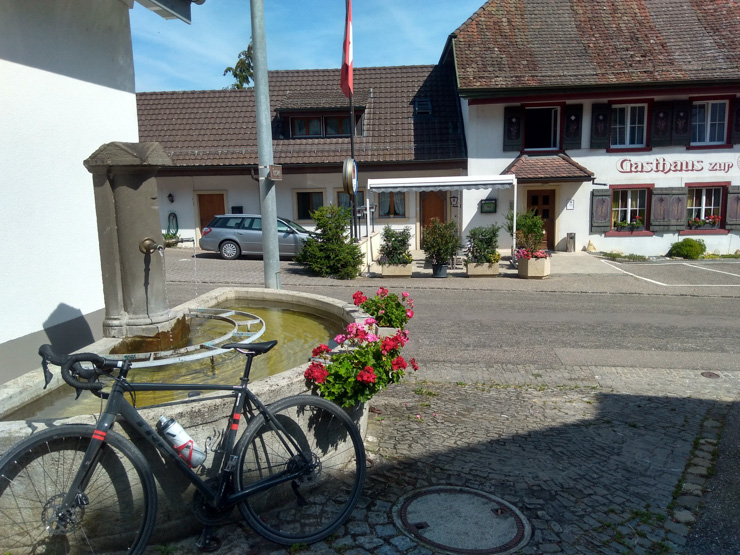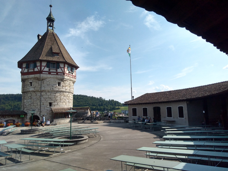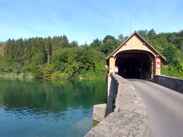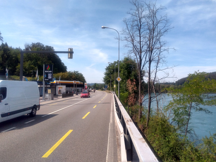 Pasada la cascada el camino se adentra por pueblitos, bosques, reservas forestales muy titinas que ayudan mucho porque proveen toda la sombra que el ciclista, en estos meses calurosos, necesita. En este momento en suiza cae nieve, pero como la ruta fue hecha en pleno verano – ya ven lo atrasada que esta la bitácora – pues calor fue lo que hubo. En algún monento la sombra se va y el paisaje cambia para unas praderas y recorridos en vías principales. Nos encontramos en Aargau, posiblemente uno de los cantones menos exitantes del país. No quiere decir que todo sea malo, pero en general mucha carretera desde Waldshut hasta Bad Säckingen me toca aguantar. Al ingresar a Rheinfelden, después de atravezar un bosque bastante largo, la cabeza empieza a mostrar signos de verdadero recalentamiento. Desde allí hasta Basilea, unos 35km, se hacen más bien renqueando debido al dolor de cabeza producto de la insolación. Por cuenta de esto la entrada a Basel no fue triunfal ni celebrada como la ruta lo ameritaba. Una cerveza, un platado de pasta y mucha mala cara fueron le que sucedieron la llegada.
