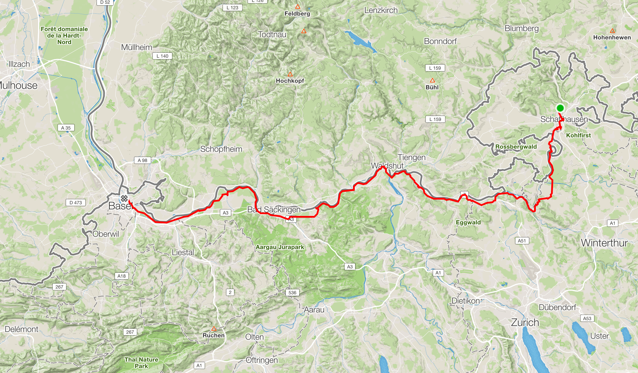 Jueves, 16 ene 2020No amerita mucha introducción. Este post solo muestra una parte de la Ruta 2 suiza que parte desde Basilea, llega al lago constanza y después de cruzar los grisones (Graubunden), se sube hasta Andermatt (Por ahí pasamos en bicicleta cuando nos trepamos el Gottard). En este caso lo hice desde Schaffhausen hasta Basilea; es decir, unos 135 kilómetros, en general planos, que tenían de especial, el encontrarse casí siempre bordeando al Rin. Resultó más dura y larga de lo esperado. Según strava, tan dada a esconder los tiempos de las paradas, esto se hizo en 5h50. En realidad la proeza tomó 7h aunque la velociadad promedio fuera de 20km/h. La primera razón fue que el calor era bastante y el motoneto, ahora bicicleto, pedalea más bien poquito cuanda recalentao. Segundo, porque las rutas ciclisticas suizas se entrecruzan y la posibilidad de tomar el camino errado siempre es altísima, lo que hace que quien ande en bicicleta tenga que para varias veces en cada pueblo para verificar si está andando por el camino correcto o si por el contrario, deberá desandar lo recorrido. Tercero, y muy importante, porque el viento suizo sea cual sea la dirección que el ciclista tome, siempre, siempre estará en contra. Por útimo, la bicicleta usada es de gravel y le tenía montados unas llantas gruesas (35), cosa que hacía que fuera más lento.